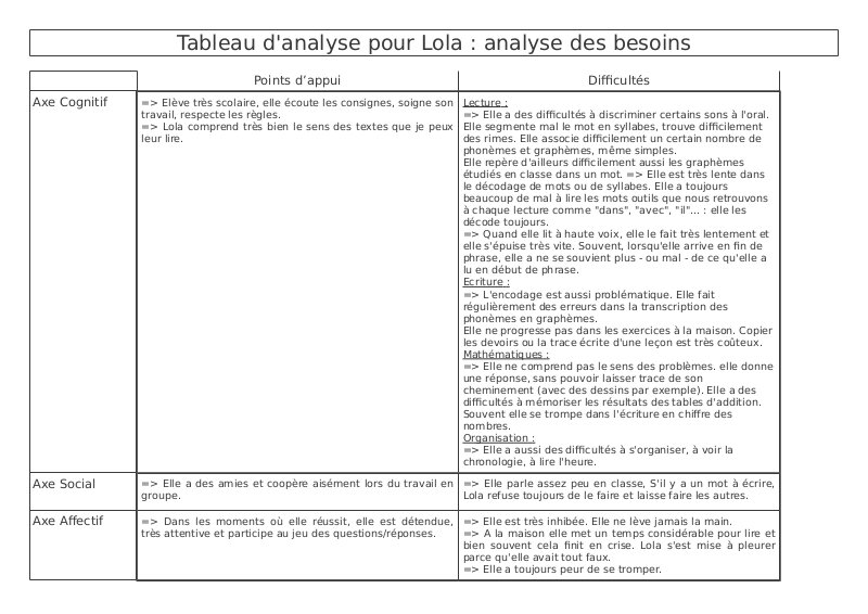 Tableau Analyse De Cas Lola CaractéRistiques Sur Les 3 Axes
