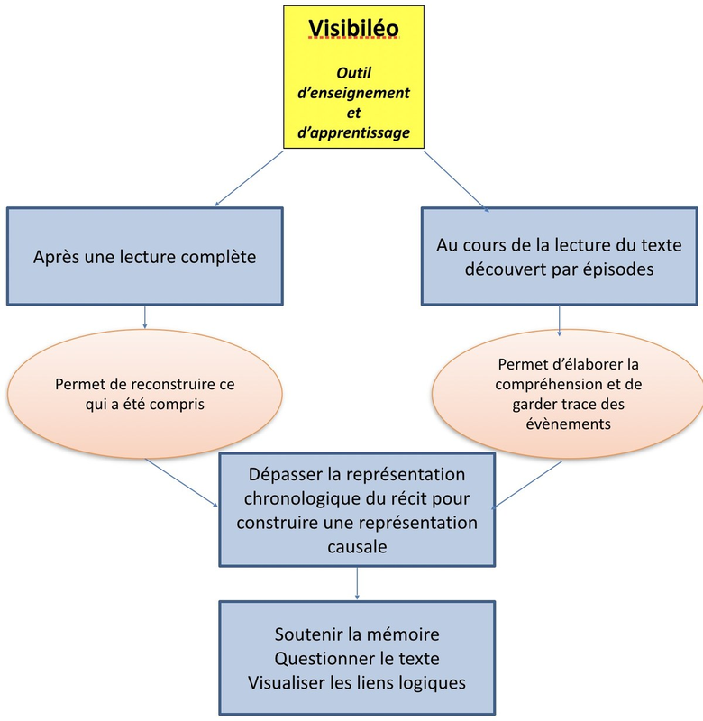 "Visibiléo" est une trace collective élaborée avec les élèves, qui rend visible l’intégration des informations, y compris implicites, et leur organisation. Il soutient la mémorisation au service de la compréhension, articule les événements et les intentions des personnages. Visibiléo, outil d’enseignement et d’apprentissage de la compréhension, matérialise les liens logiques. Cet outil permet d’un seul regard, d’appréhender à la fois la structure de l’histoire dans son déroulement, mais aussi le parcours du lecteur qui doit combler les « blancs » du texte.